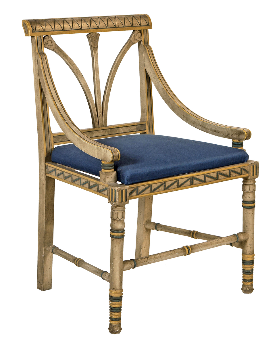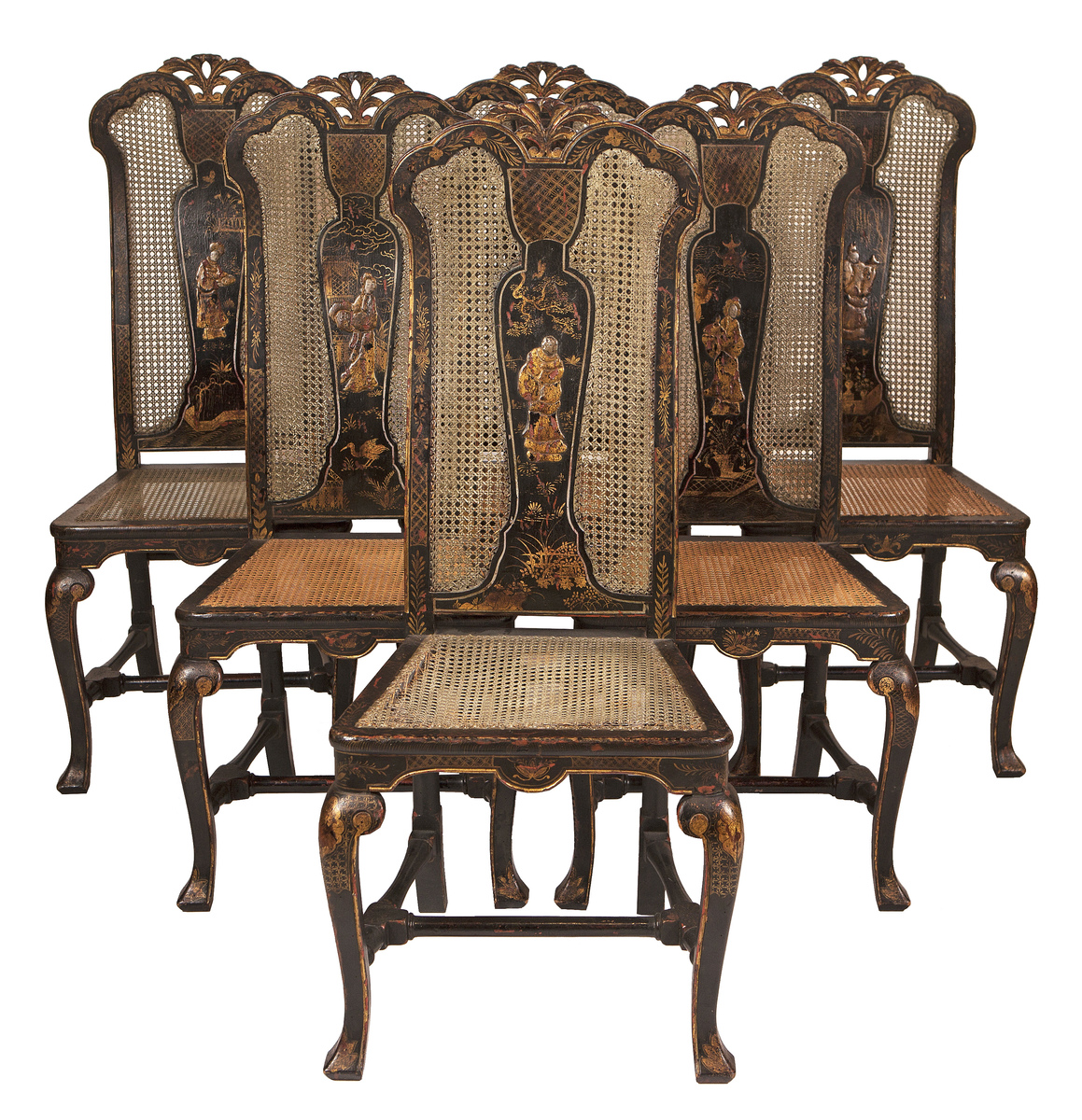 A set of six George II style partly gilded, lacquered and caned chairs with chinoiserie decoration