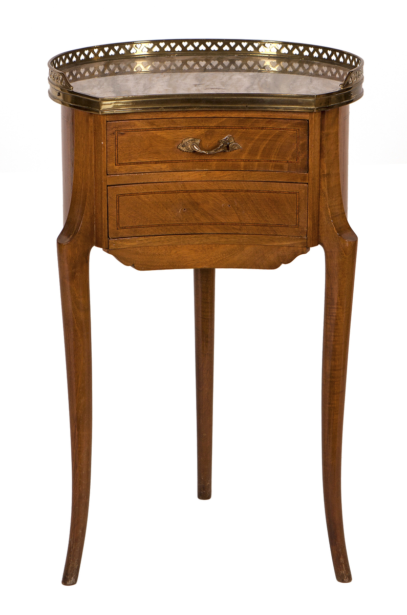 A brass mounted, marble top walnut kidney-shaped side table with two drawers, 20th Century