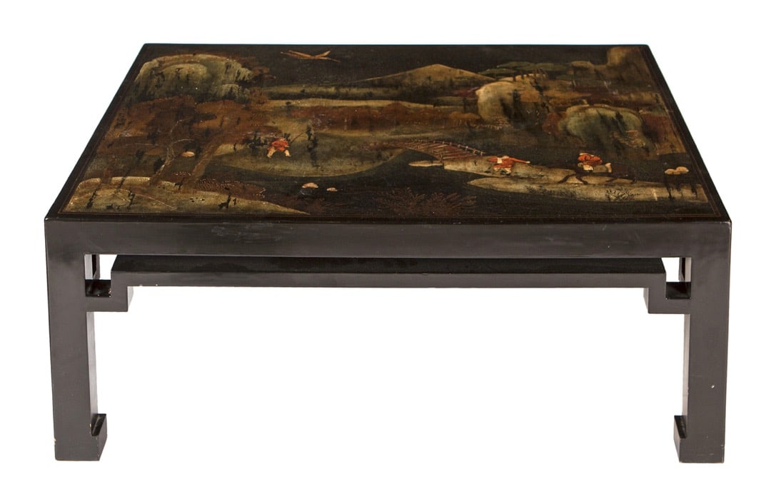 An Oriental style black lacquered coffee table depicting a landscape with pagodas