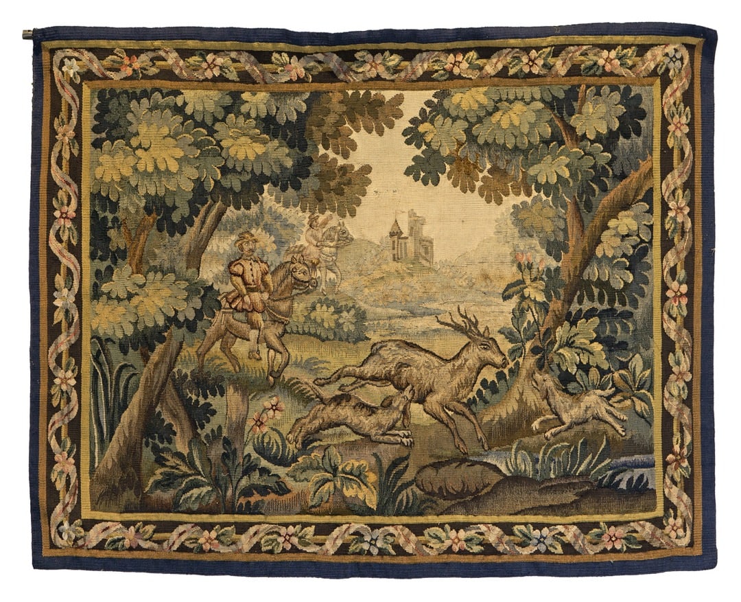 An Aubusson style tapestry depicting a deer hunting scene, 20th Century