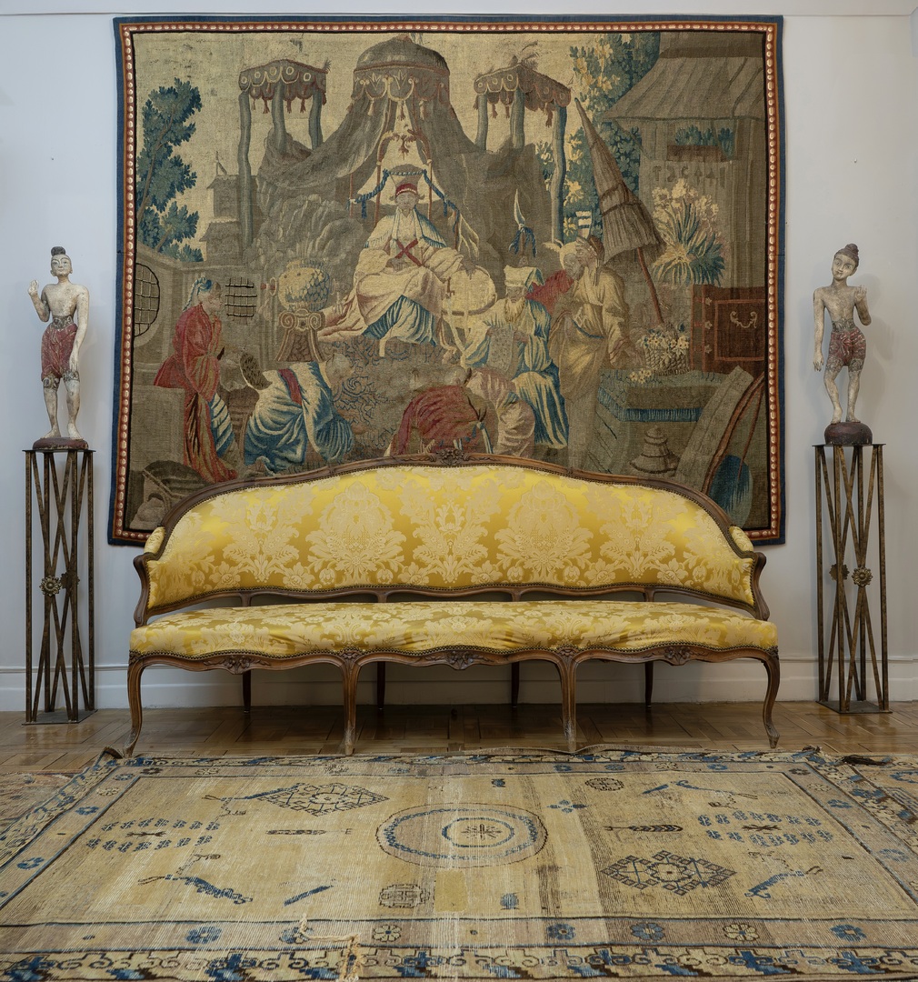 A Louis XV Aubusson Chinnoisserie tapestry depicting "The Audience of the Emperor of China" after François Boucher and a cartoon by Jean-Joseph Dumons, third qu...