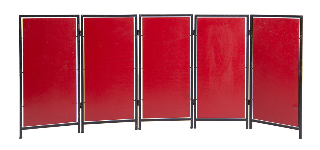 A French red and black lacquered metal five-panel screen, 1930s