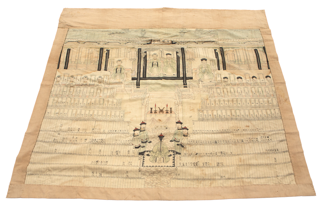 A painted textil fragment depicting Chinese ancestors and a silk embroidered with dragons, Qing Dynasty, 19th century