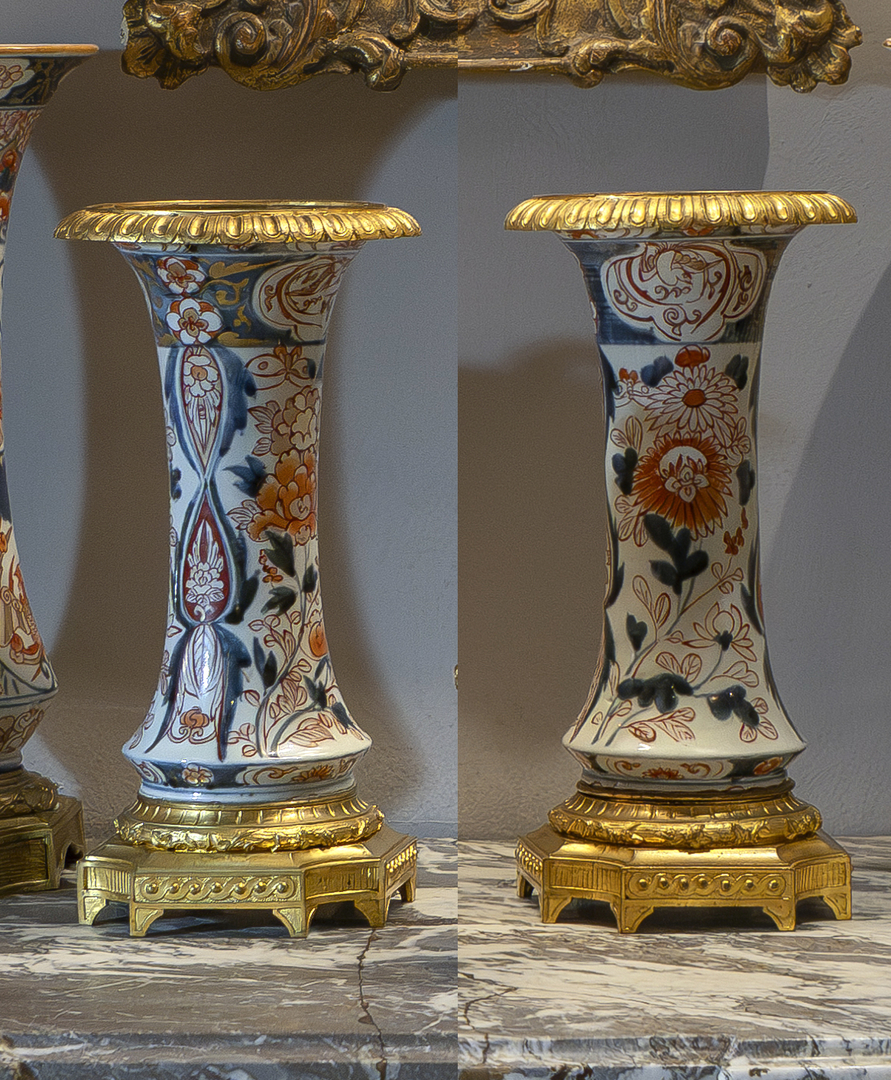 Pair of "Imari style" Chinese porcelain "cornet" vases with gilded bronze mounts, 19th century