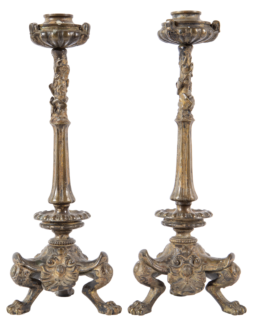 Pair of Charles X style patinated metal candlesticks with claw feet, 19th century