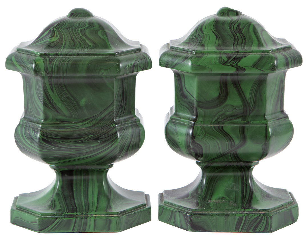 Pair of English faux-malachite resin bookends in the form of urns, Thomas Blakemore
