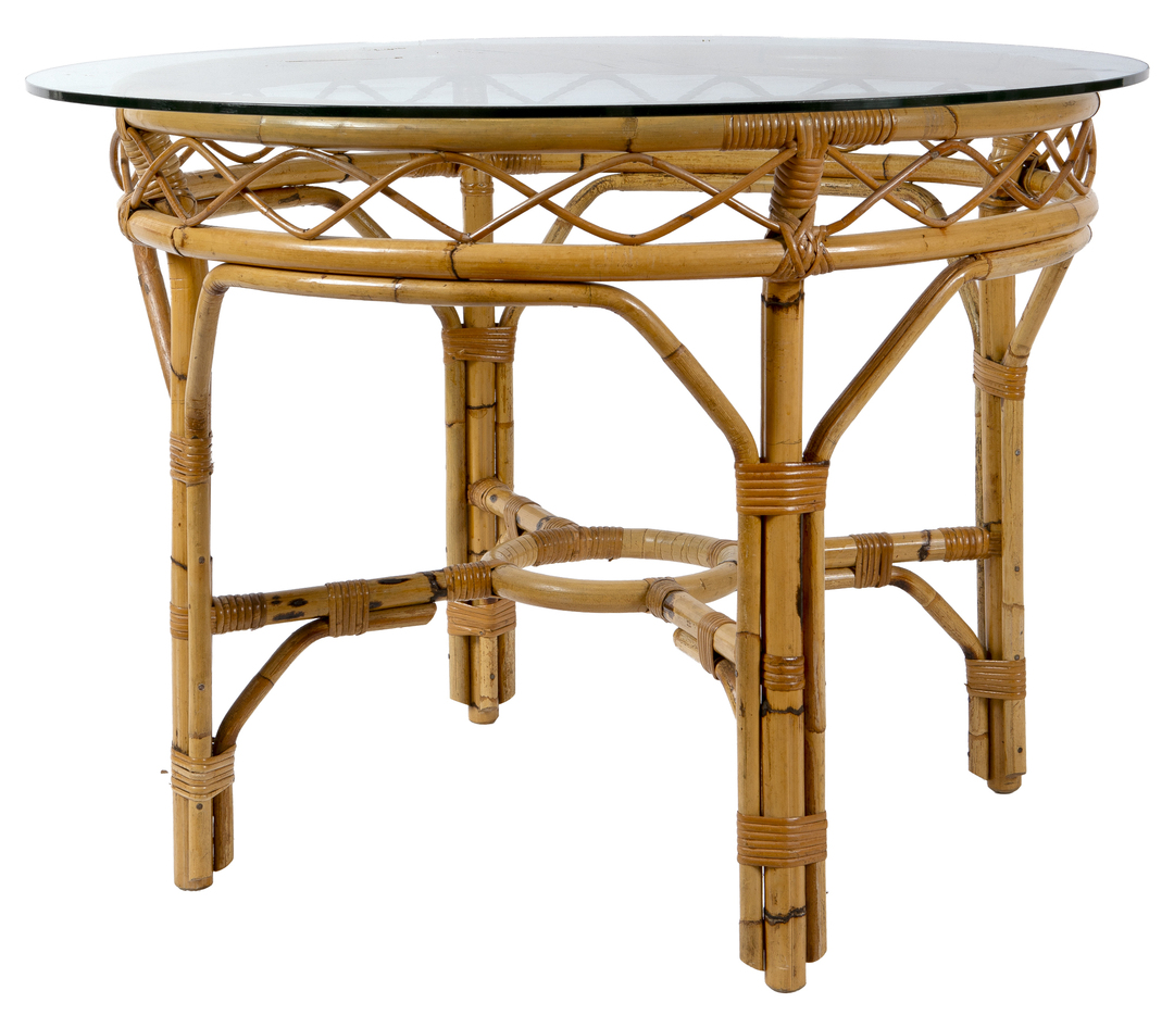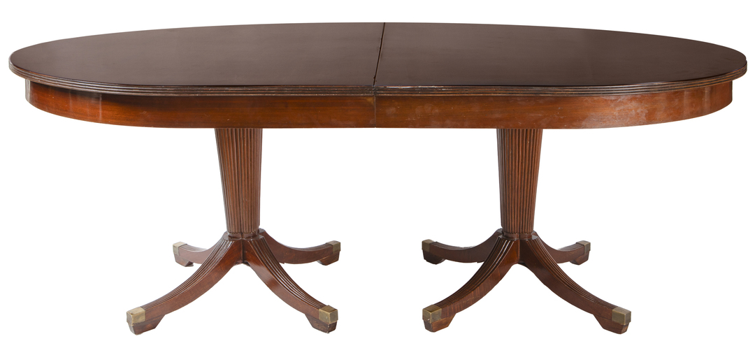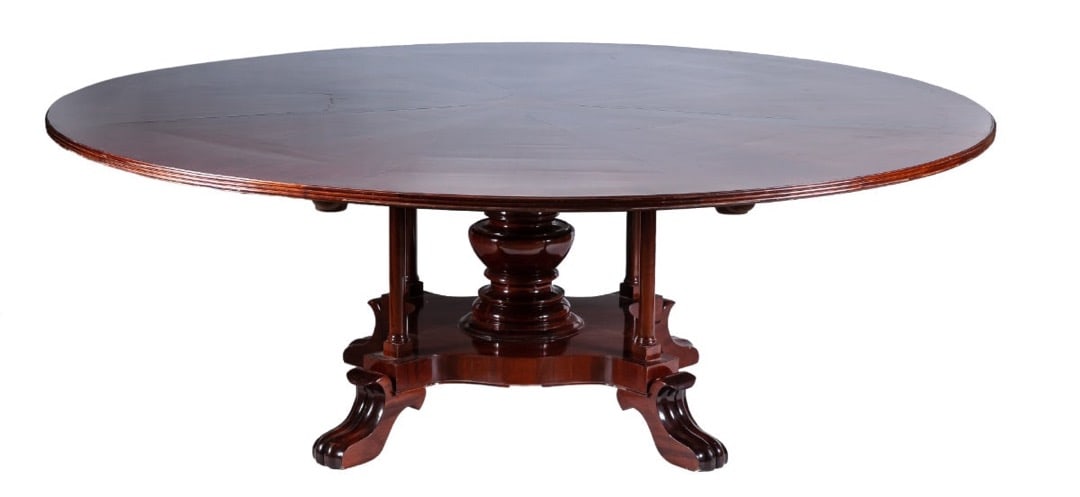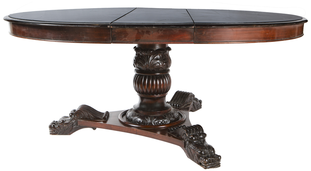 A mahogany dining table with a central pedestal on feet in the shape of dragons
