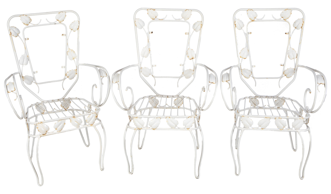 Set of three painted metal garden chairs with leaf decoration, 20th Century