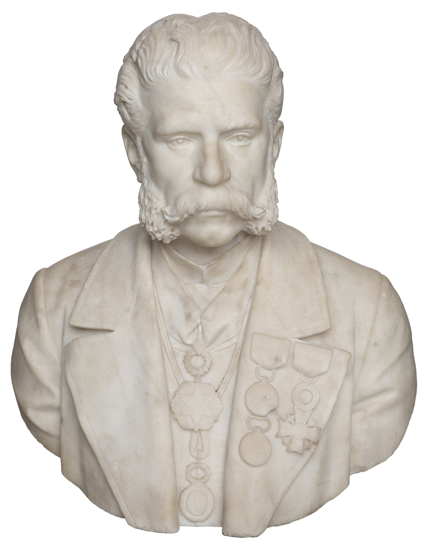 A carved, polychromed and partially gilded wood sculpture representing St. Paul, on marbleized pedestal, 18th Century
