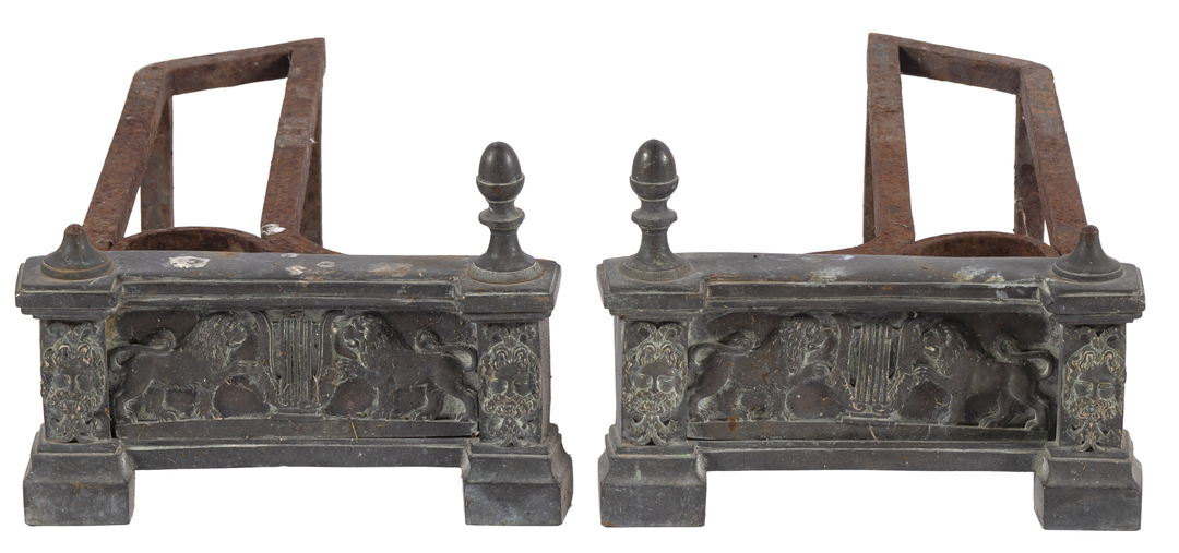 A pair of Empire style bronze and wrought iron andirons early 19th Century. Two finnials missing