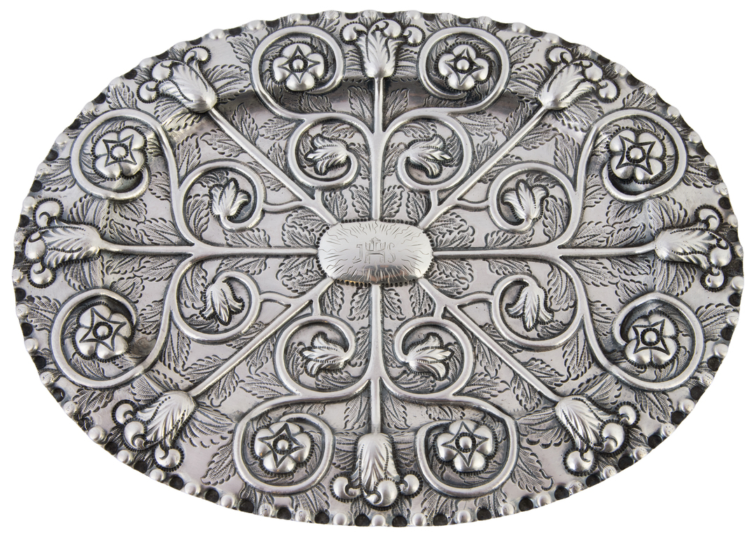 An oval embossed silver tray with the cyphers of The Jesuit Order