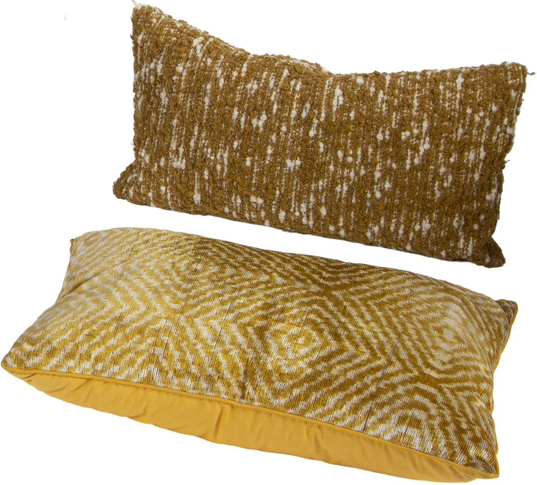 Two velvet cushions with geometric print in yellow and ochre