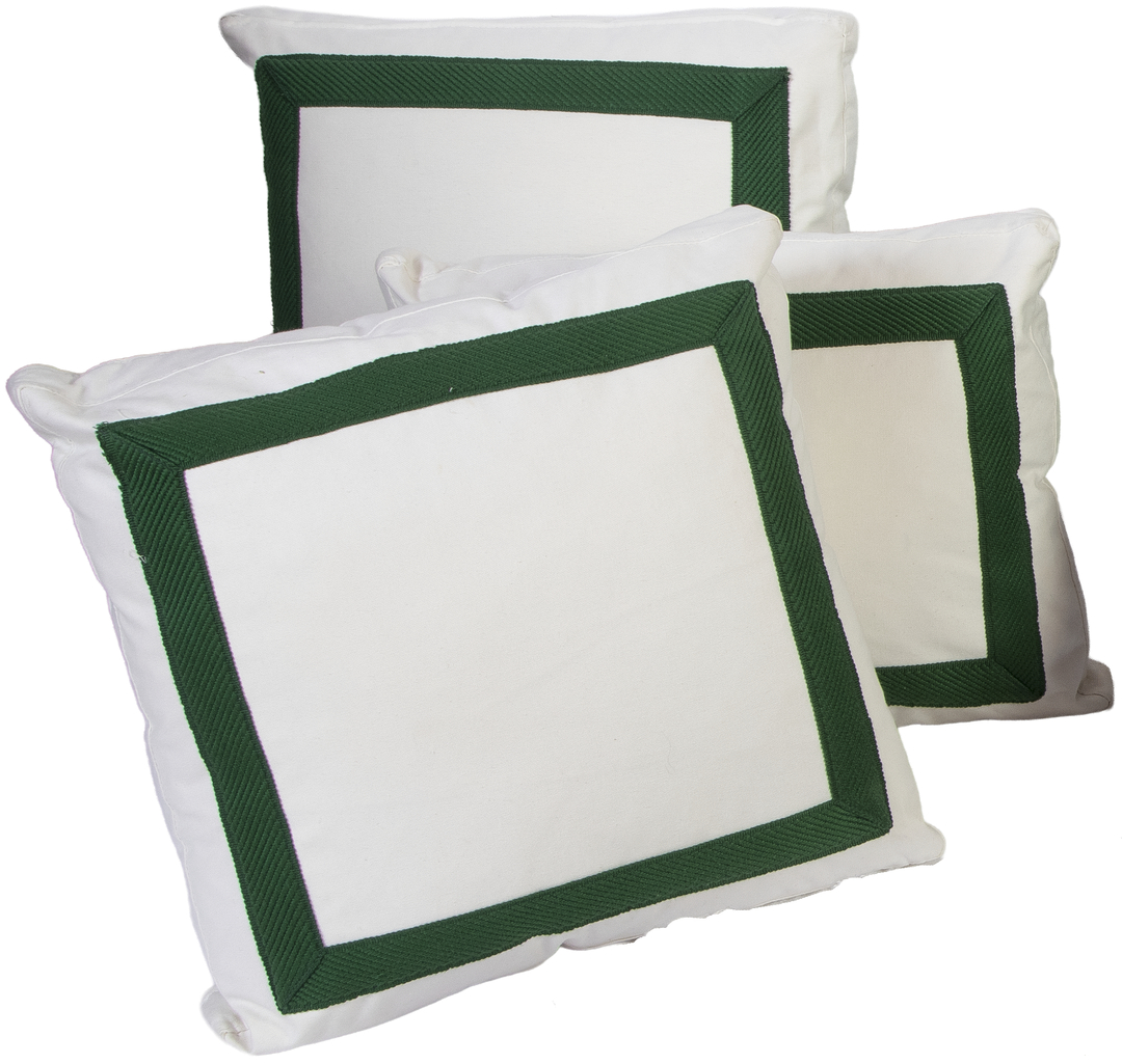 Three square cushions upholstered in white cotton with green piping