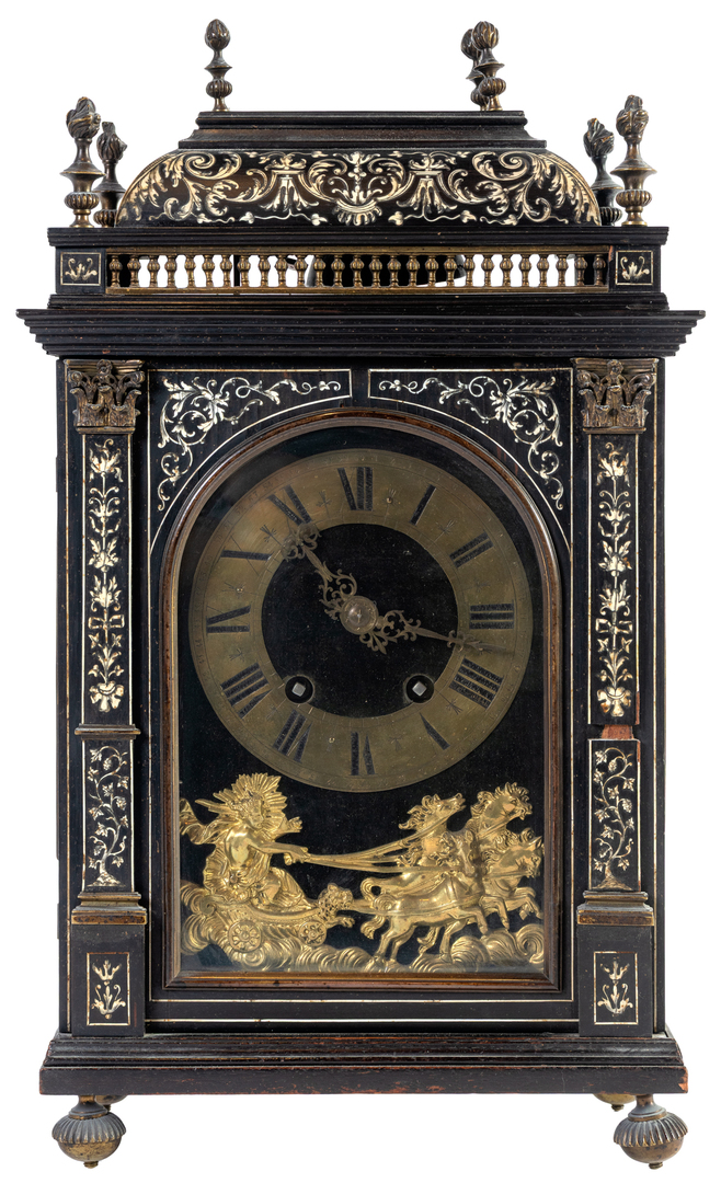 A French ebonized wood clock with inlaid bone decoration, Napoleon III period, 19th Century