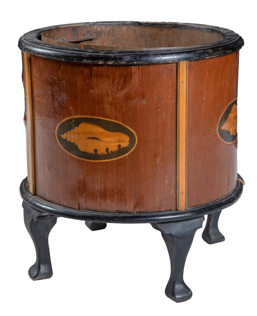 A round mahogany veneered marquetry planter with shell motifs. Damages