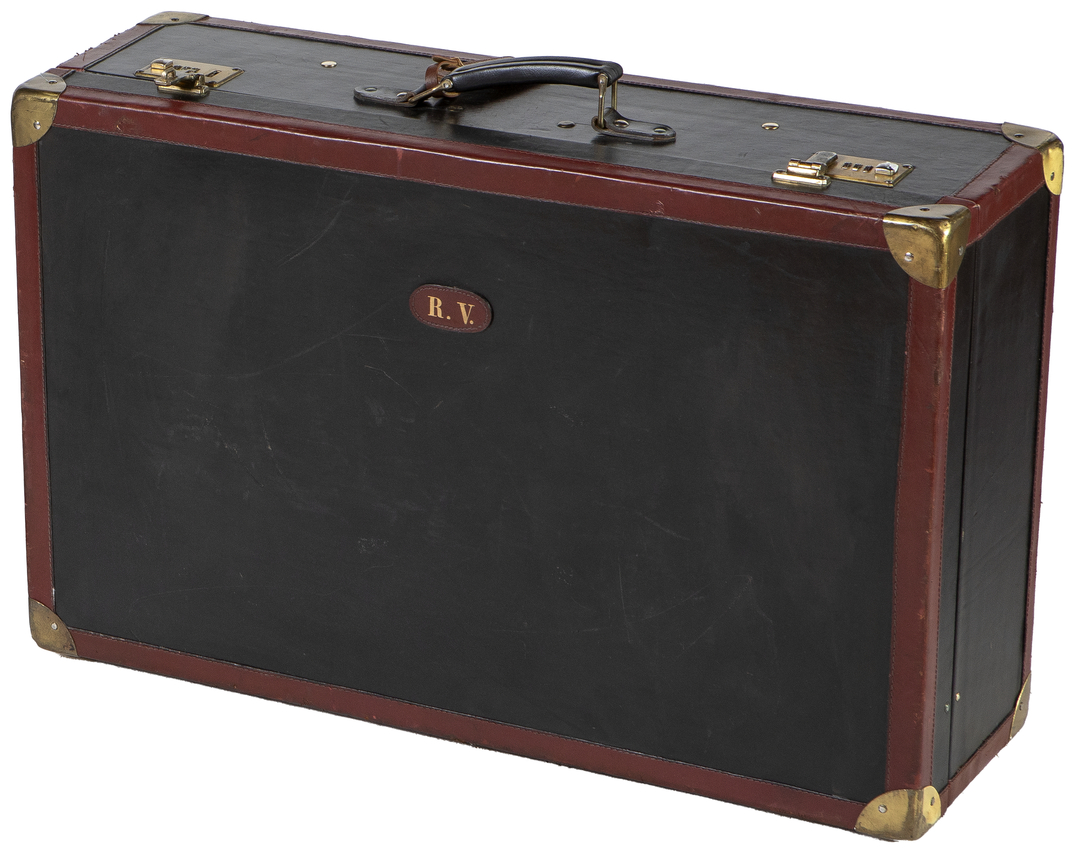 Black and brown leather suitcase from Harrod's, London. With initials RV. Wear