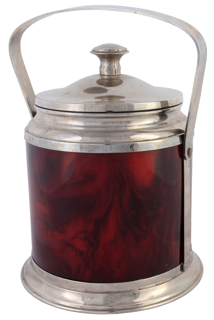 A stainless metal and faux-burlwood ice bucket, 70s - 80s