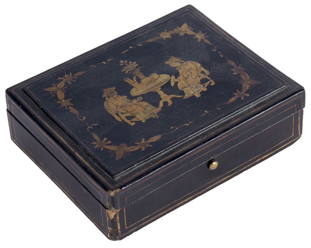 Small black lacquered wooden box with chinoiserie decoration