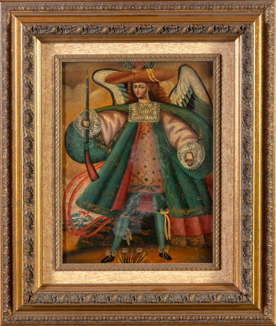CUZCO SCHOOL 20th century"Archangel arquebusier"Oil on canvas attached to panelDamages39 x 29 cm100 - 150 €