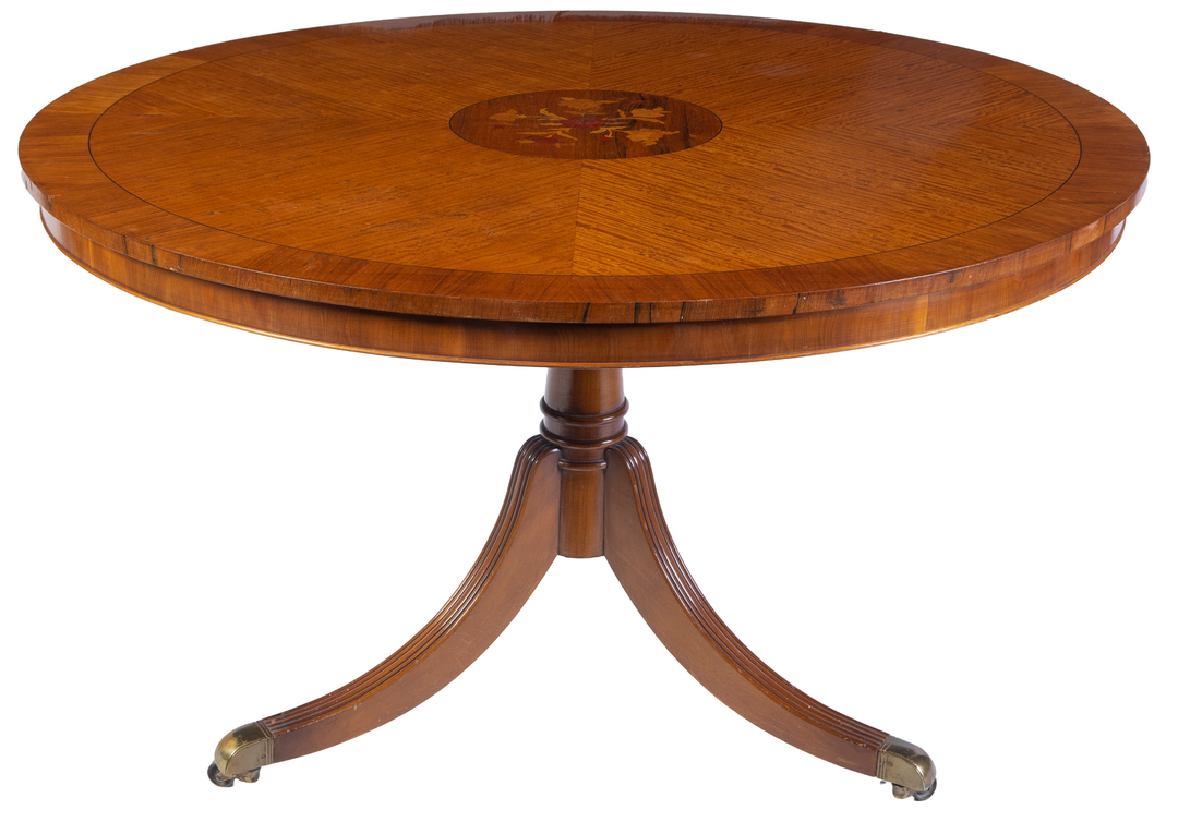 A marquetry and mahogany dinning table on sabre legs. Losses