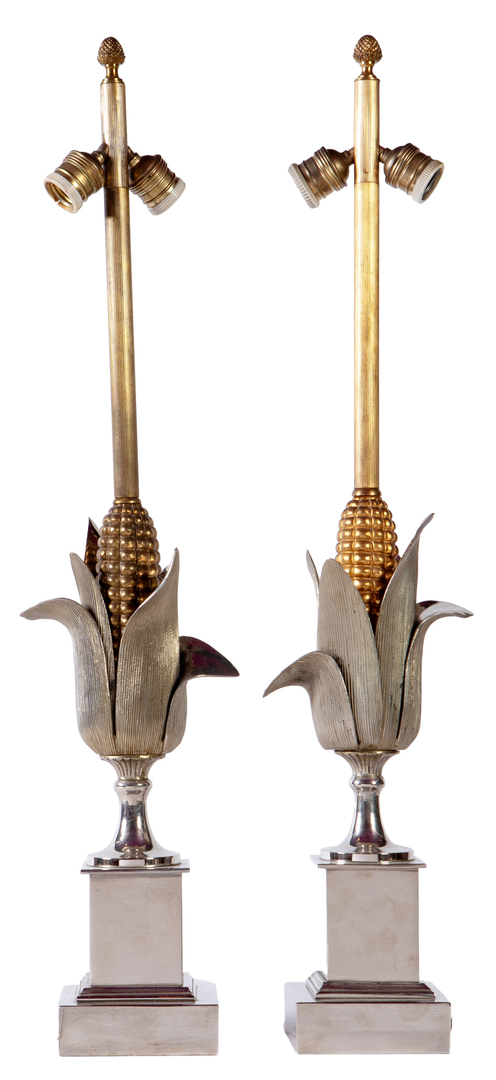 A pair of silver and gold metal table lamps in the shape of corncobs in the style of ""Maison Charles"". France, 1960s