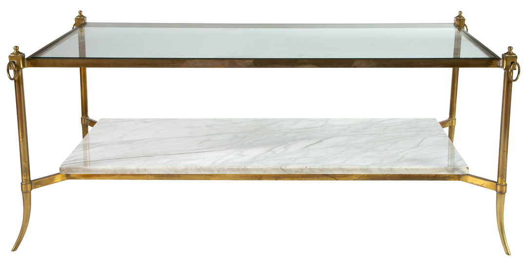 A rectangular brass and glass coffee table, with marble shelf