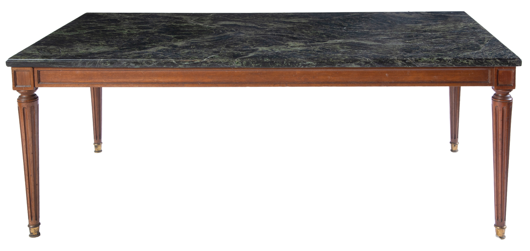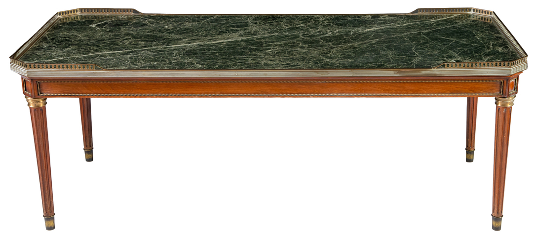 A rectangular mahogany coffee table with green veined marble top with openwork gallery