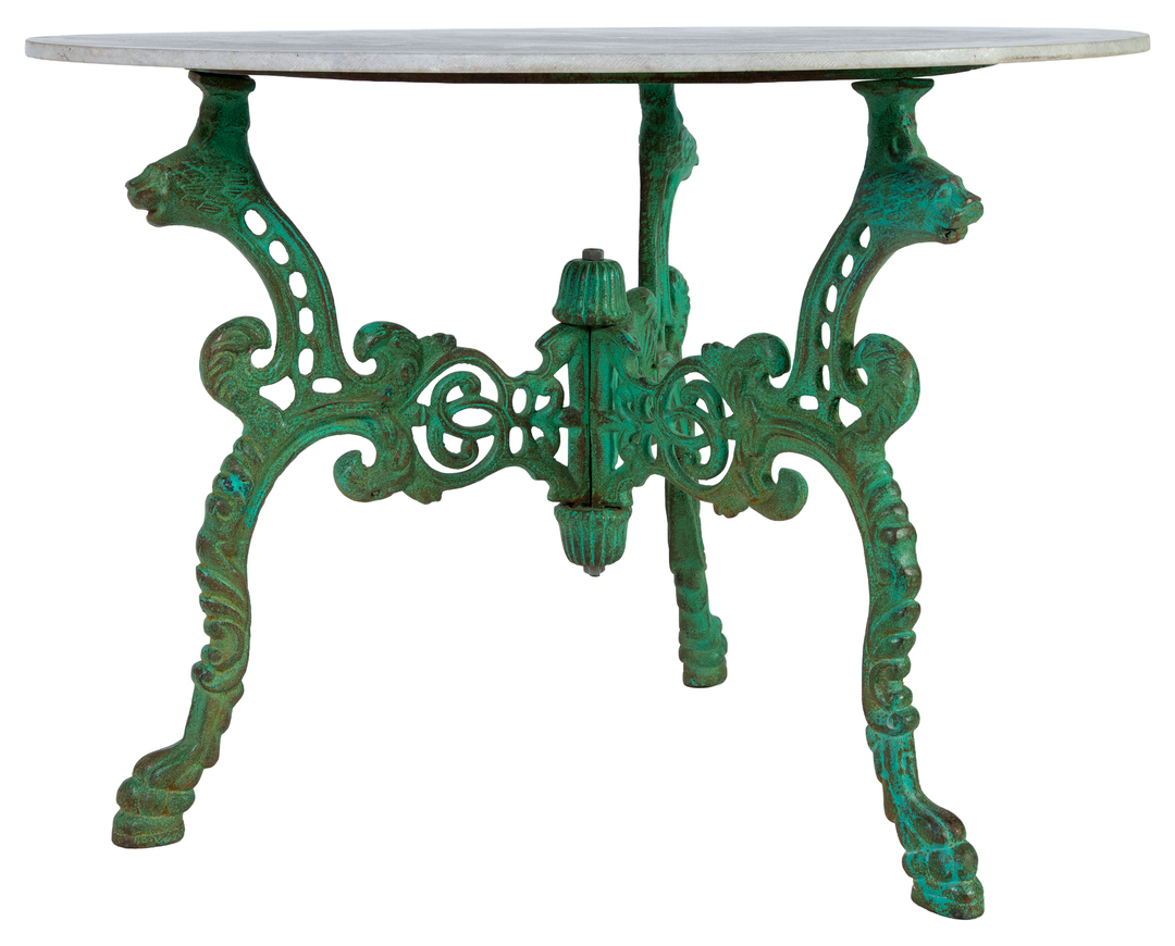 Circular table with green painted iron legs and white marble top