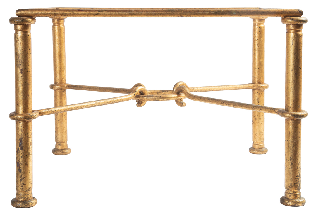 A gilt iron square side table with glass top