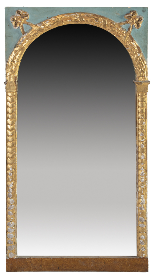 A Baroque carved, faux-marble and gilded wood mirror with semicircular arch and acanthus leaf decoration
