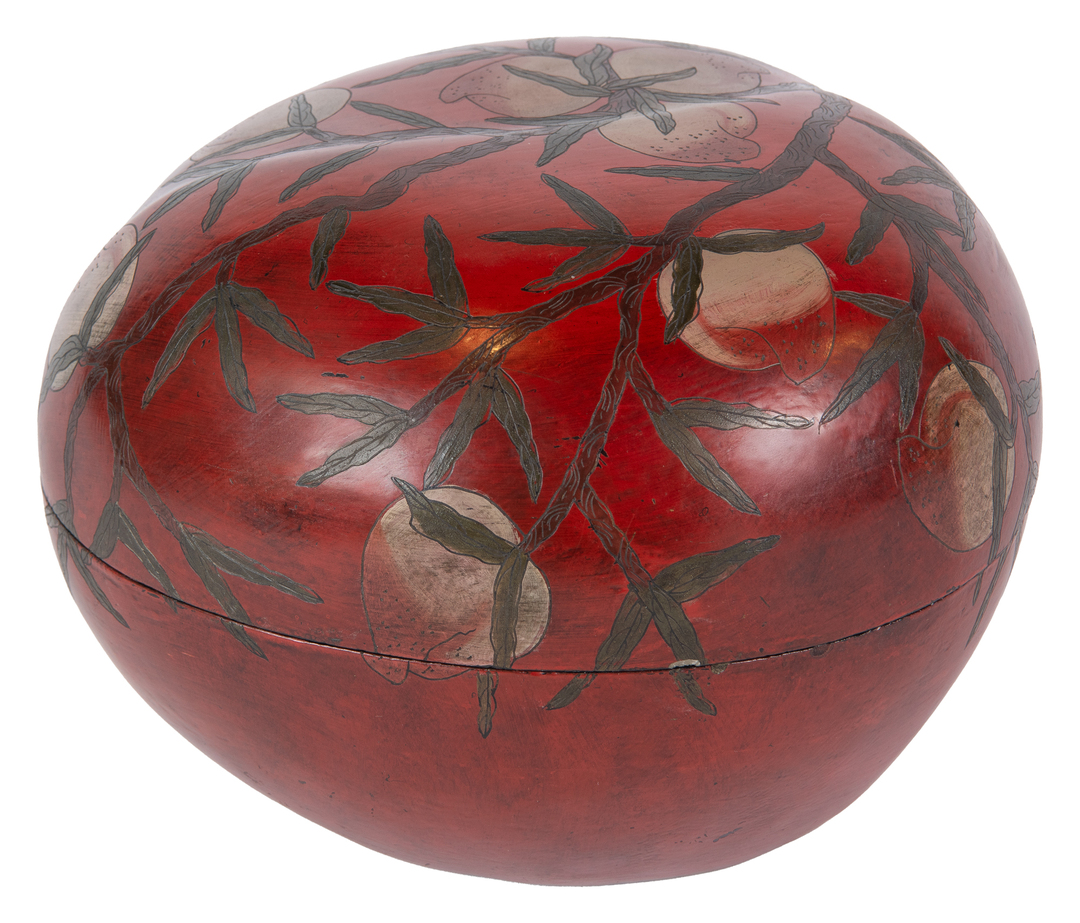 A heart-shaped red lacquer presentation box with polychromed peaches decoration