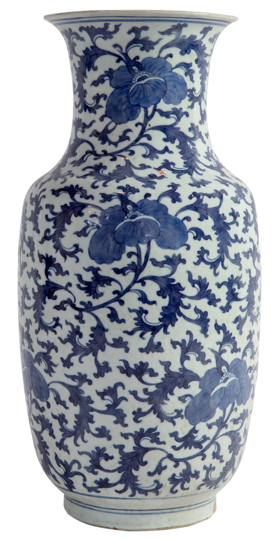 A blue and white Chinese vase with stylized scrolling decoration. Restored