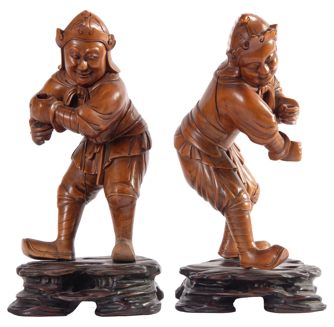 A pair of carved wood oriental warrior figures