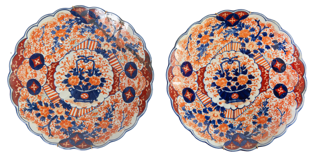 A pair of Japanese Imari porcelain dishes, Meiji period, 19th Century. One of them restored