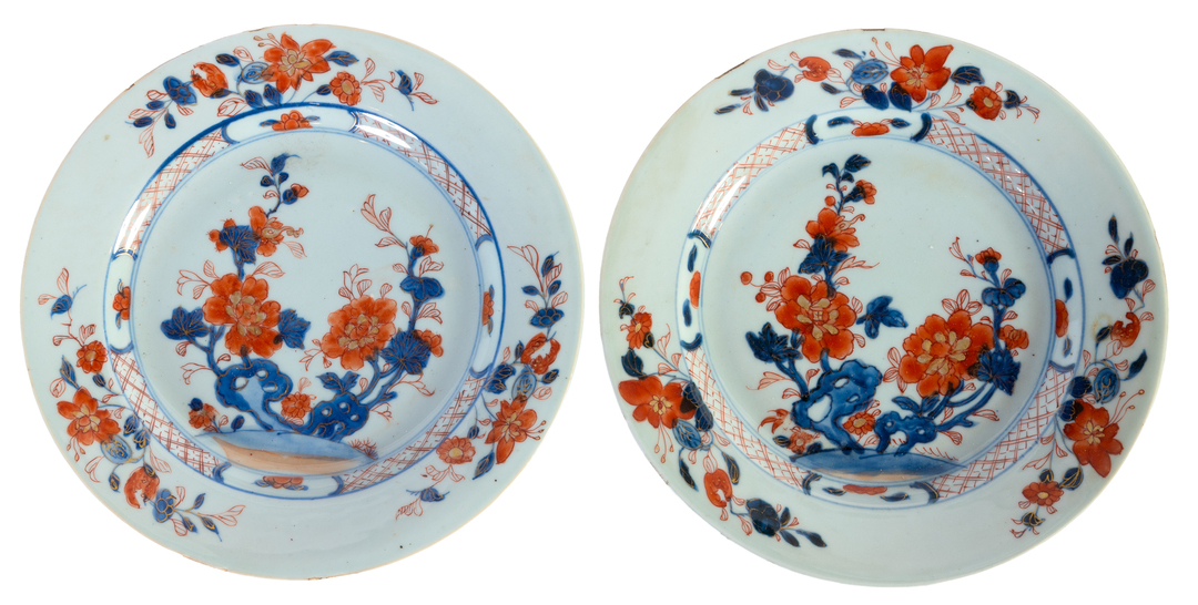 A pair of Chinese Imari porcelain dishes, late 18th Century. Small chips